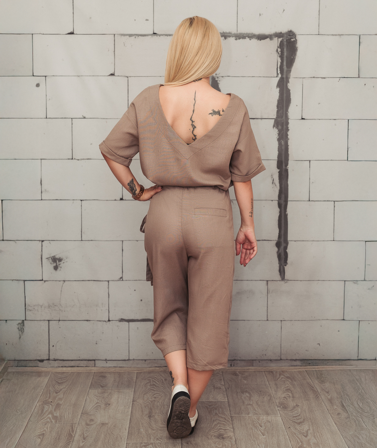 - Кройка на блузата: паднал ръкав и изчистен V-образен гръб , който внася лек флирт в иначе свободната кройка.
